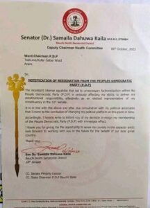 In a letter dated October 6, 2025, and addressed to the PDP Ward Chairman of Tsakuwa/Kofar Gabar Ward in Azare, Senator Kaila—who also serves as the Deputy Chairman of the Senate Committee on Health—said the unending crisis had hampered his effectiveness as a lawmaker.